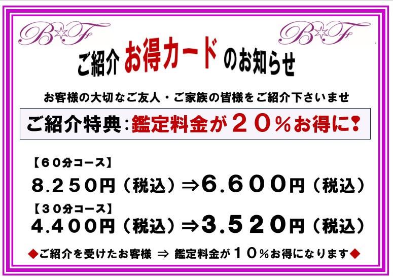 毎月、その月のお客様へ恋愛・結婚・相性・金運・仕事・健康など全てを占って鑑定料金が10パーセントOFFとお得な感謝祭となっております。誕生月のお客様は是非、ご利用下さい!