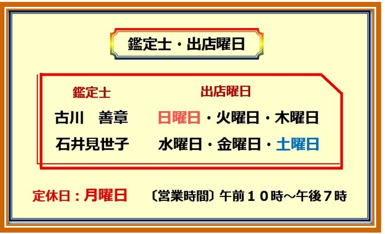 鑑定士 古川善章出店日 :日曜日・火曜日・木曜日