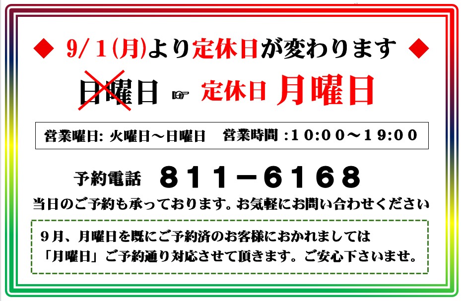 定休日 : 日曜日 ➡ 月曜日に変わりました