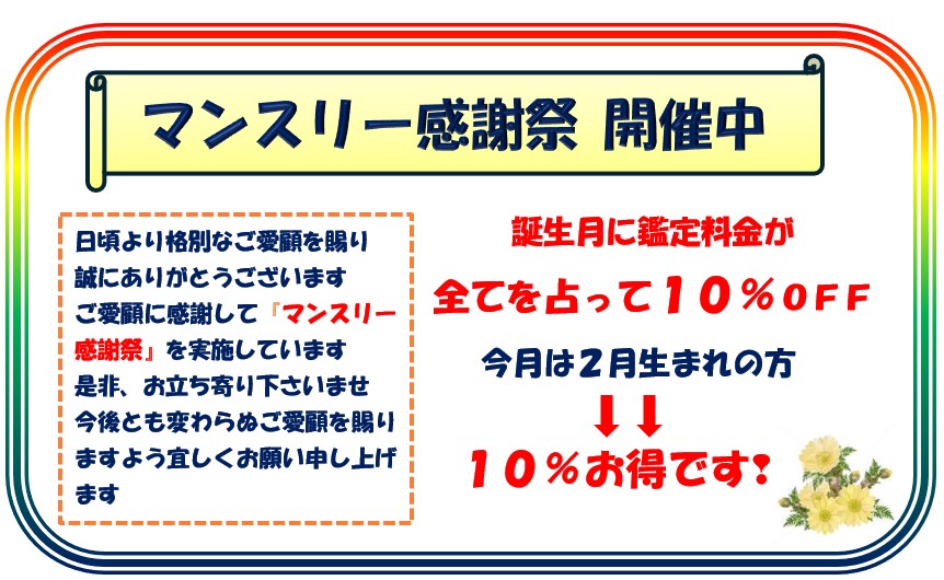 ◆手相・姓名判断・九星気学・タロット等、複数の占術を組み合わて鑑定し、恋愛、結婚、相性、家庭、仕事、金運、人間関係などを占い、ズバリあなたの迷いの選択や悩みを解決し開運へと導きます。