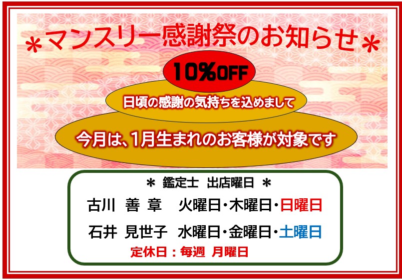 毎月、その月のお客様へ恋愛・結婚・相性・金運・仕事・健康など全てを占って鑑定料金が10パーセントOFFとお得な感謝祭となっております。誕生月のお客様は是非、ご利用下さい!